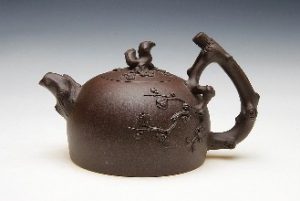 Decorated zisha teapots are dominated by molded, relief, and appliqué decorative techniques. New modern techniques include inlaid gold, inlaid silver, inlaid clay, and twisted clay. Bao Zhongmei decorated this pot with inlaid silver and clay. His wife, Shi Xiuchun, created the teapot.