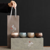 This set of four handmade Kung Fu tea cups will bring elegance and simplicity to your tea ceremony. The tea cups are crafted from natural coarse pottery and fired at 1310℃ using traditional kiln techniques. Solid and durable in structure, each piece shows its own unique texture and natural charm. This four-color kung fu tea cup set reflects a harmonious balance between rustic beauty and Zen-inspired design, makes it ideal for daily Kung Fu tea ceremonies or as a gift for friends and family.