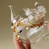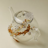 Crafted from durable, heat-resistant borosilicate glass, this beautiful teapot blends exquisite artistry with practical design. The design is inspired by the beauty of sunset clouds and white roses, the pearls and crystal blossoms gracefully surround the teapot, the glass is crystal clean, when tea is poured into the teapot, the amber hue resembles the warm colors of the evening sky, creating a beautiful effect. This glass teapot will perfectly match any home decor style and will show your elegant taste whether in use or on display.