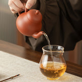 This Yixing purple clay tea set, inspired by the aesthetics of the Eastern tea ceremony, combines practicality and elegance. It includes a pear peel Zhu ni clay Siting teapot, a glass fair cup, and four teacups in different colors: Zhu ni clay, purple clay, Huang Duan clay, and bean green clay. Each symbolizing a different season—red for spring, yellow for summer, brown for autumn, and green for winter. The design reflects the cycle of nature, reminding us that while seasons change, the joy of tea remains eternal.