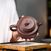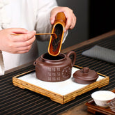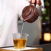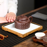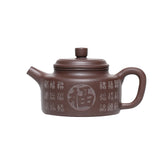 Crafted from authentic Yixing purple clay, this Dezhong teapot embodies elegance and stability. The body of the teapot is beautifully engraved with the Chinese character "Fu" symbolizing blessings and prosperity. More than a functional teaware for enhancing the taste of your tea, it also a meaningful piece of art that carries cultural heritage and good fortune.