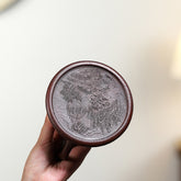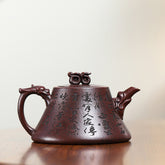This Yixing purple clay teapot is elegant in shape and majestic in appearance. The body tapers gracefully from a wide base, creating a sense of balance and stability. The spout and handle are decorated with dragons, symbolizing strength and good fortune. Both the body and bottom of the teapot are engraved with tranquil landscapes, giving a quite and meditative atmosphere. An ancient poem is inscribed on the back side, echoing the landscape and adding a touch of artistic refinement. It is not just a teapot, but also a work of art that embodies profound cultural heritage and quiet beauty.