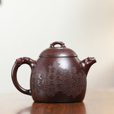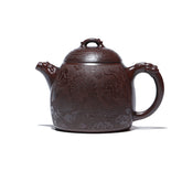 Elevate your tea-drinking experience with this Yixing purple clay teapot. This teapot is made of rare iron-red dragon blood clay. This clay is known for its warm dark red color and smooth texture. The teapot is in the Qinquan shape, a traditional vessel from the Qing Dynasty that resembles a weight and symbolizes balance, stability and elegance. It is intricately carved with dragon patterns. The dragon is a symbol of identity and status, representing victory and success. It perfectly integrates the element of the dragon, and the details are properly handled, showing the craftsman's superb skills and inheritance of traditional culture.