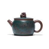 This handmade Yixing purple clay teapot is crafted from purple clay and green clay. Its balanced and dignified body exudes timeless elegance. The teapot is engraved with a picture of fish jumping in the waves, symbolizing the legendary "carp leaping over the dragon gate" and symbolizing success, good fortune, and prosperity. The lid features a delicately carved Pixiu, said to attract wealth and fortune and ward off evil.